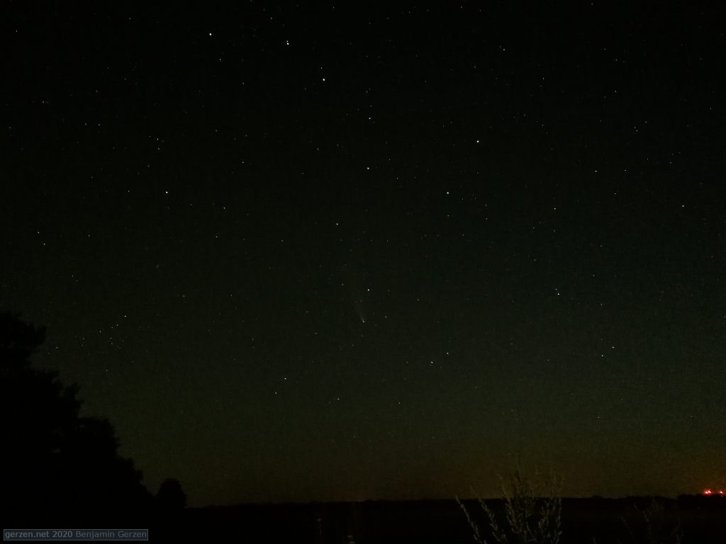 Вооружившись биноклем, фонарем и смартфоном на штативе вышли в поле. Кометы нигде не было. Ковш большой медведицы отчетливо блестел на небосклоне, но горизонт под ним все еще был освечен зарей.