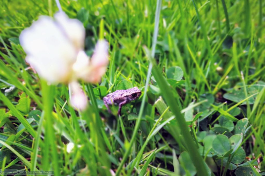 Beim Picknicken im Gärten der Welt sollte man behutsam den Rasen in der Nähe von Teichen betreten. Dieser kleiner Frosch war gerade mal von der Größe einer Fingerkuppe.
