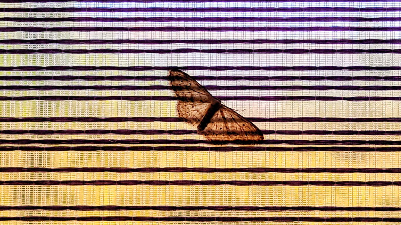 Мотылёк заночевал на занавеске и вписался точно в границы линий. В широком формате фотография выглядит как флаг нового государства.